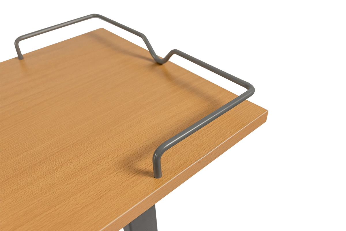 Der Beistelltisch hat eine zweigeteilte Tischplatte: Der kleinere Teil bleibt als Ablagefläche starr, der größere lässt sich als Lesepult schwenken. Er verfügt über einen stabilen Stand und eine schlanke Optik. Der Metallrahmen schützt Gegenstände vor dem Fall. Die U-Form des Fahrgestells sorgt für platzsparende Aufbewahrung hinter dem Nachttisch oder Bett.